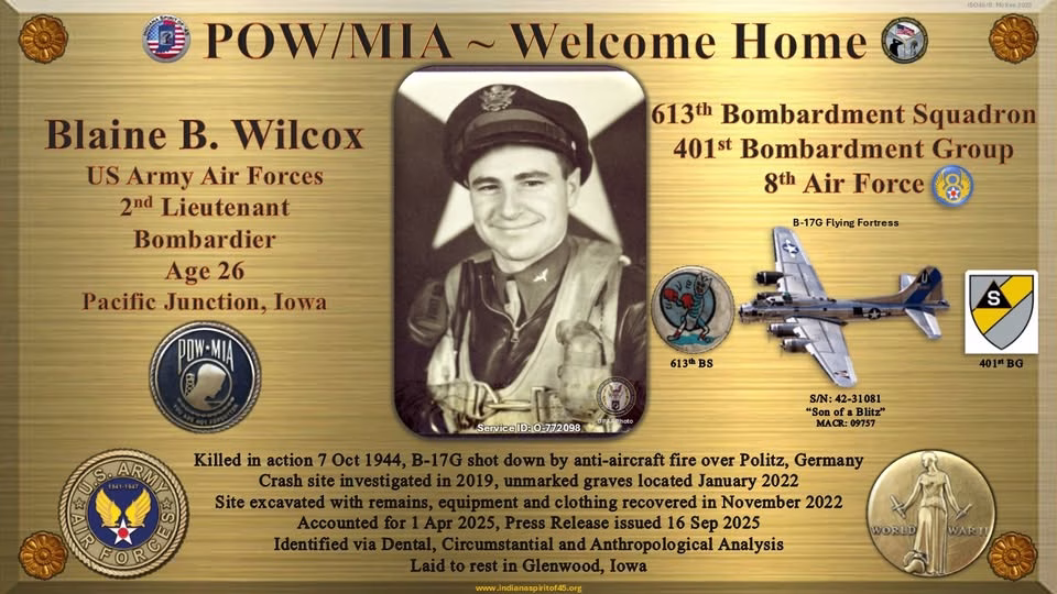 The Defense POW/MIA Accounting Agency announced today that U.S. Army Air Forces 2nd Lt. Blaine B. Wilcox, 26, of Pacific Junction, Iowa, killed during World War II, was accounted for on April 1, 2025.