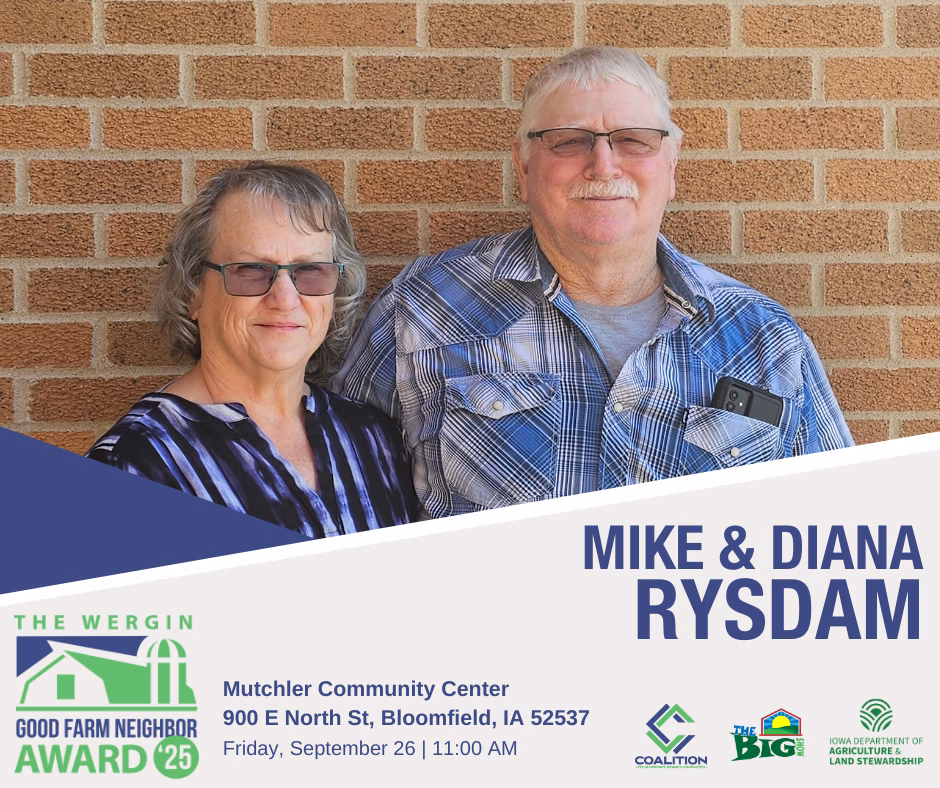 Iowa Deputy Secretary of Agriculture Grant Menke will present the Rysdam family of Davis County with the Wergin Good Farm Neighbor Award on behalf of Iowa Secretary of Agriculture Mike Naig on Friday, Sept. 26. The presentation will take place during an event beginning at 11:00 a.m. at the Mutchler Community Center in Bloomfield.
