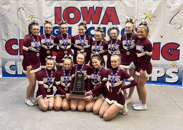 The cheer team headed to the Iowa State Fairgrounds last week to compete in the Class 2A State Cheerleading Championships and for the second straight year, the Mustangs took home the state title.