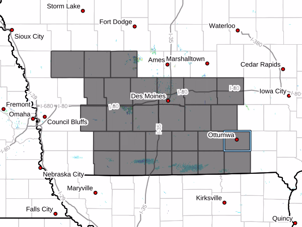 The affected cities include Leon, Stuart, Knoxville, Centerville, Osceola, Pella, Exira, Albia, Atlantic, Adair, Panora, Mount Ayr, Allerton, Chariton, Audubon, New Market, Seymour, Denison, Norwalk, Bedford, Carlisle, Casey, Fontanelle, Creston, Waukee, Earlham, Guthrie Center, Humeston, Corydon, Winterset, Lamoni, Oskaloosa, Adel, Corning, Ottumwa, Grinnell, Greenfield, Des Moines, Carroll, Jefferson, Lenox, Indianola, Bloomfield, Newton, Perry, and Bayard.
