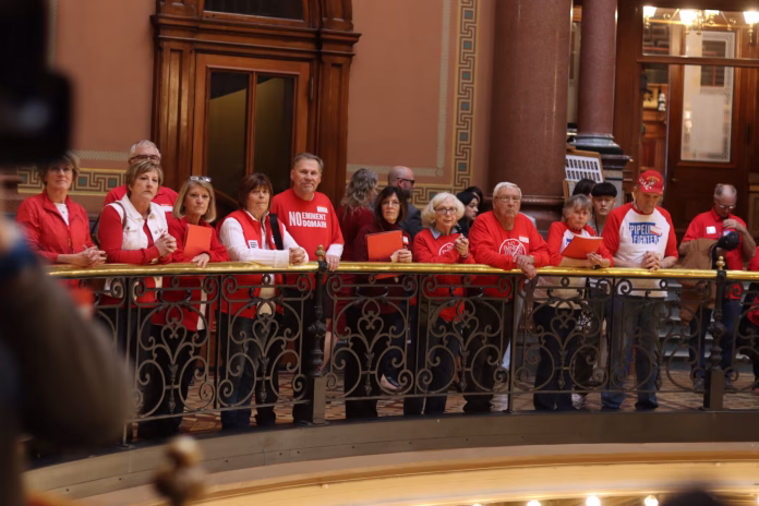 Landowners, wearing their signature red attire, joined in a prayer led by Rockwell City pastor Dillon Brandt. He prayed lawmakers would “seek what is best for the people, the land and future generations.”