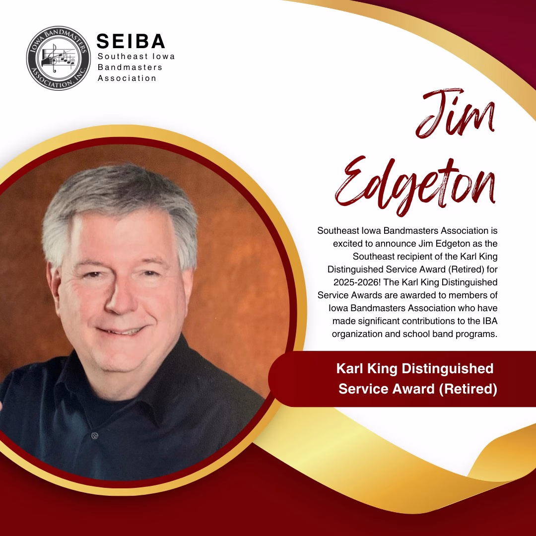The Southeast Iowa Bandmasters Association (SEIBA) is proud to announce that Jim Edgeton has been selected as the Southeast recipient of the Karl King Distinguished Service Award (Retired) for 2025-2026. This prestigious honor recognizes members of the Iowa Bandmasters Association who have made significant contributions to both the IBA organization and school band programs throughout their careers.