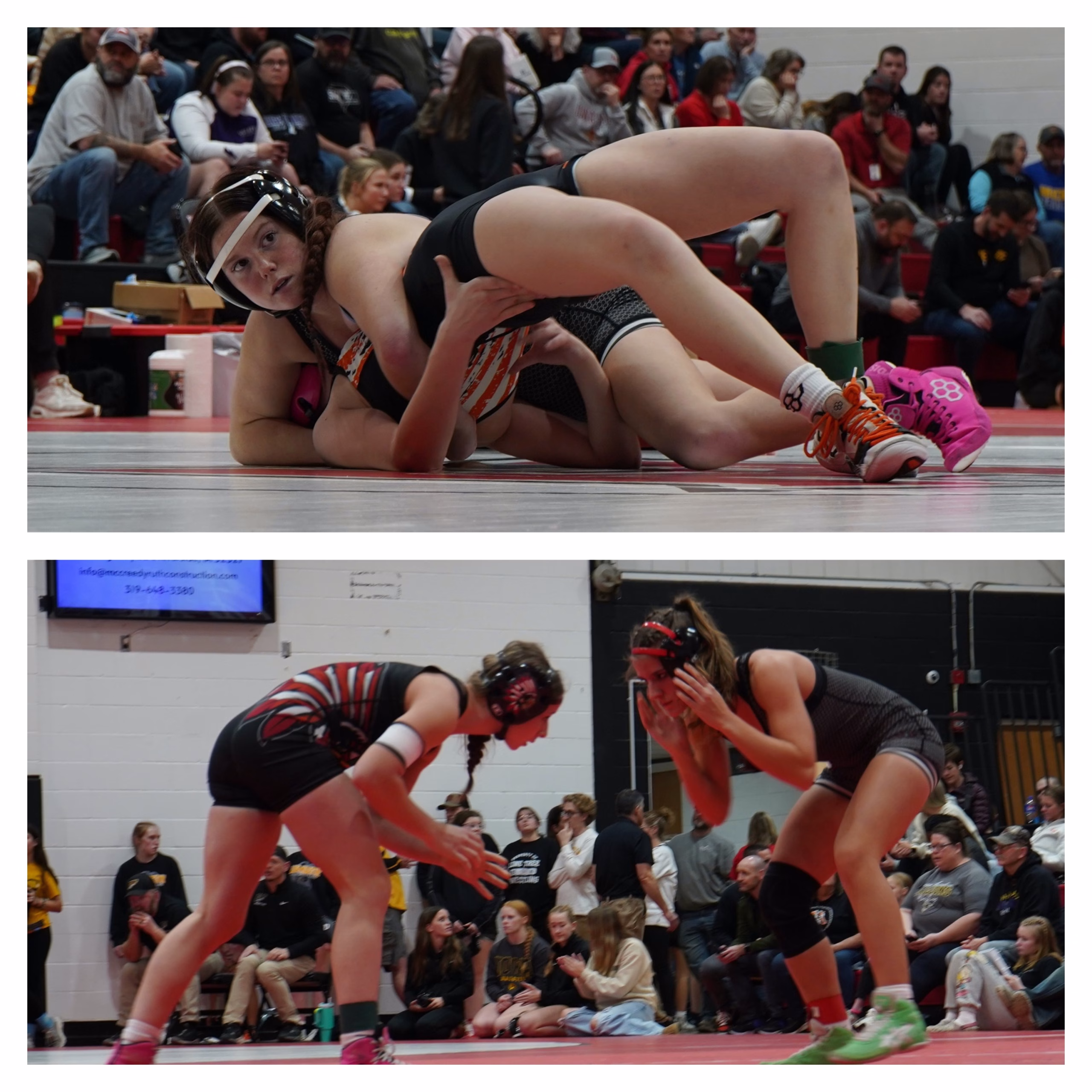 Armoney Adams earned fifth place at 100 pounds. The fourth-seeded Adams lost a tough 11-6 decision to Iowa City Liberty’s Ella McGonegle, then defeated West Liberty’s Julie Garcia by second-period fall at 3:27 after leading 9-7. Adams secured fifth place with an 11-4 decision victory over Louisa-Muscatine’s Grace Keltner, avenging Keltner’s earlier victory over teammate Rory Philips.