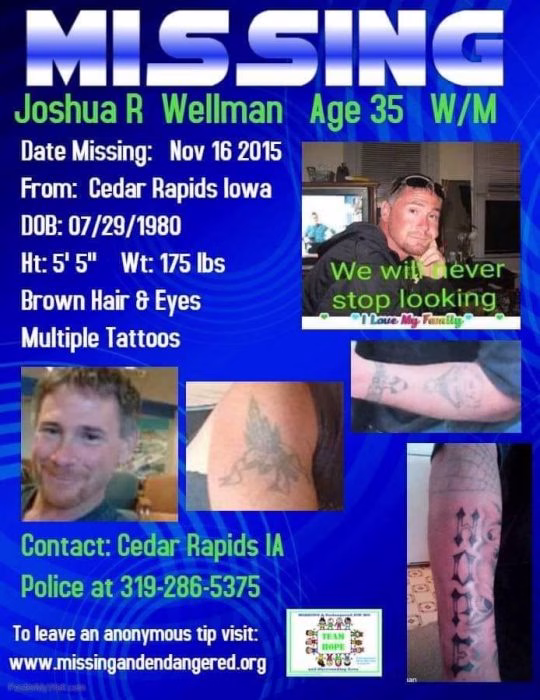 Joshua Ryan Wellman, a 35-year-old Vinton native, vanished on November 12, 2015, and his family has been searching for answers ever since.