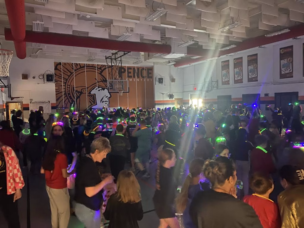 Principal Jones revealed the news to her staff at the end of a professional development session on Friday, March 27th, with a video presentation. The day also included a short video, confetti poppers, cake, and a group photo. On Monday, March 30th, the entire school—staff and students—celebrated together in the gymnasium with the lights off, light-up glasses, music playing, and glowing necklaces for a morning dance celebration.