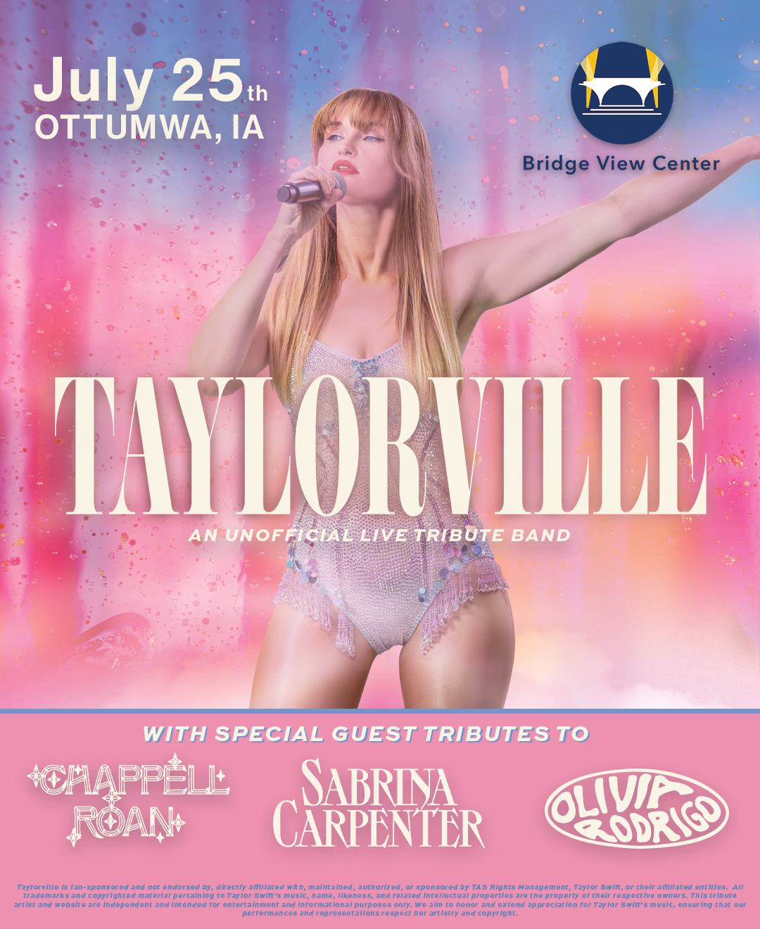 Attention Swiftie Nation! Get ready to be immersed into the world of Taylor Swift like never before. Bridge View Center is pleased to welcome Taylorville: An Unofficial Live Tribute, live in concert, Saturday, July 25, 7 p.m., in Ottumwa, Iowa. Tickets go on sale Friday, March 27, 10 a.m. Tickets start at $19.89. Venue-Pre-Sale for Bridge View Center email subscribers is Thursday, March 26, 10 a.m. – 11:59 p.m. Tickets are available online at bridgeviewcenter.com, through Ticketmaster’s mobile app or in person at Bridge View Center ticket office (Monday- Friday, 8 a.m.- 5 pm.).