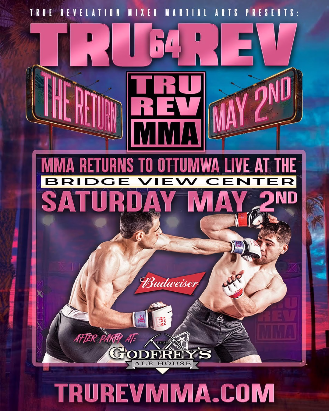 The Bridge View Center is pleased to welcome Tru Rev Mixed Martial Arts (MMA) back to where it all started! On Saturday, May 2, 7 p.m., Tru Rev MMA will mark its 64 th event in 17 years. Several Iowa-born fighters will enter the cage, as will several rising star-athletes. General admission tickets $29. A limited number of reserved, VIP seating is still available at $59. Tickets are available online at bridgeviewcenter.com, through Ticketmaster’s mobile app or in person at Bridge View Center ticket office, located at 102 Church