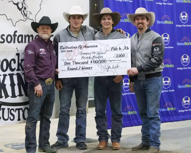 Round two brought even more excitement, ending in a tie at the top. Quincey McDonald and Brock Poulin both delivered standout rides, each earning 87 points. McDonald put together a solid run on “100 Even Money,” while Poulin matched him ride-for-ride on “917 Blackout.” Both bulls came from Double S Bull Company, part of the Extreme Bull Riding Tour.