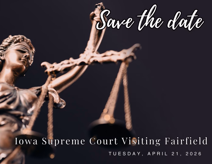 The Iowa Supreme Court will visit Fairfield on Tuesday, April 21st for oral arguments at Fairfield High School, marking a historic occasion for the community and the Jefferson County Bar Association.