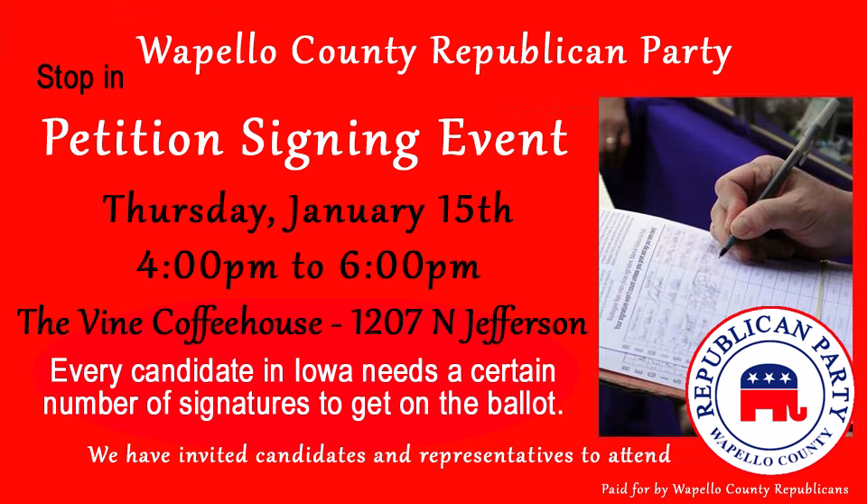 Wapello County Republicans is a solely volunteer organization. We rely on donations from people like you to fund our numerous activities to elect our Republican candidates. Donate online to WCR or mail check to 2851 Oak Meadow Dr Ottumwa, IA 52501